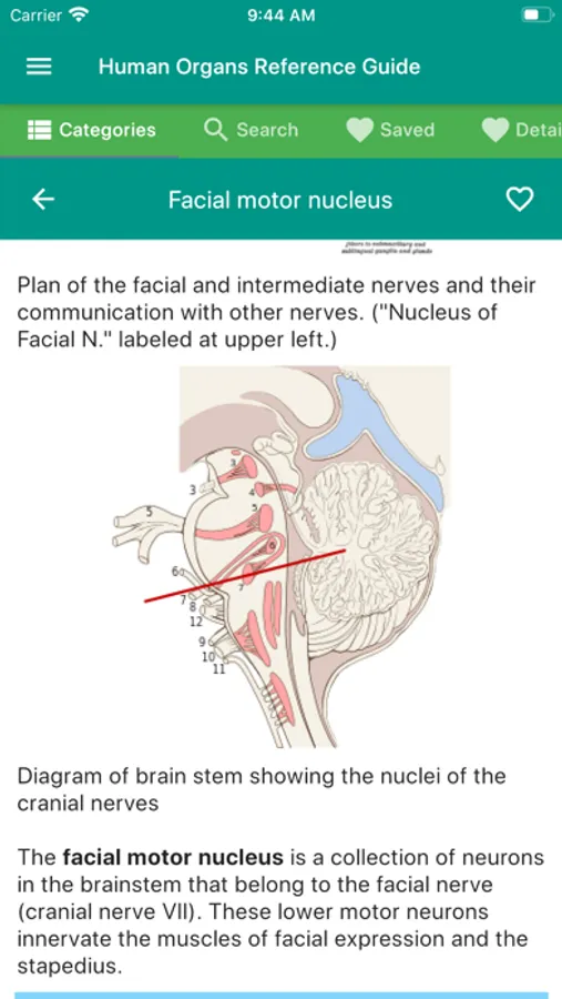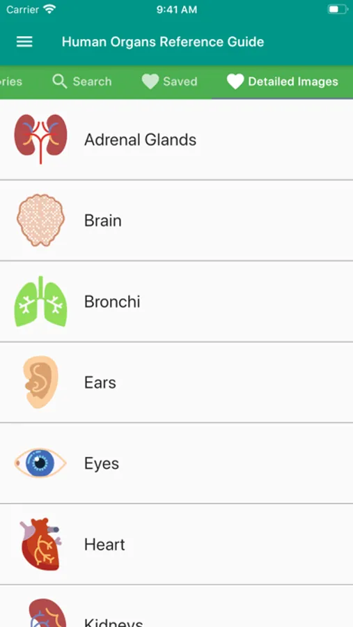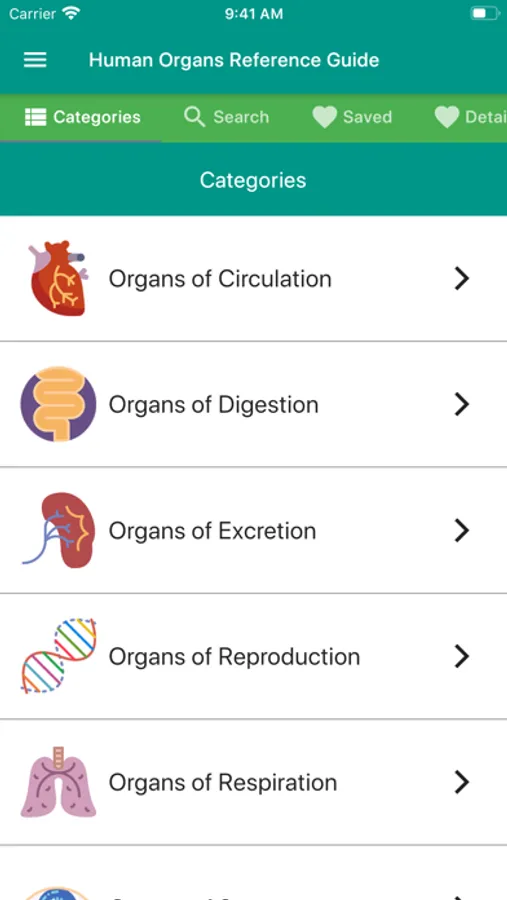 This apps covers information about each organ in the human body and splits them up into 8 categories: Nervous System, Digestion, Respiration, Excretion, Endocrine System, Circulation, Senses and Reproduction.