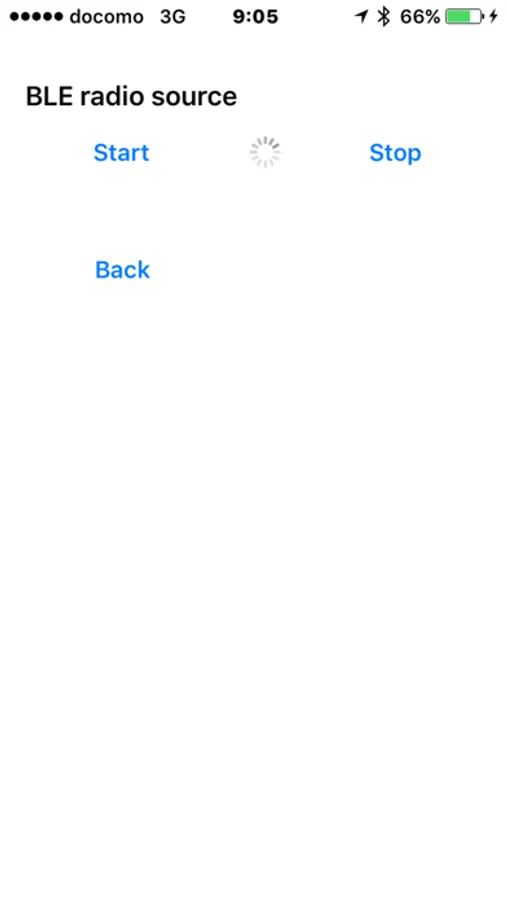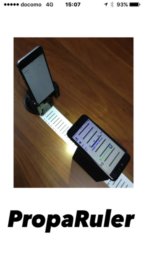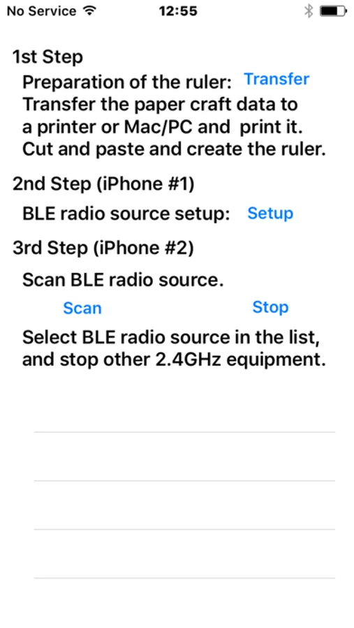 Next, start this application on the iPhone #1, press the Setup button in 2nd Step on the screen , press the Start button on the BLE radio source screen, then set it as the transmission source. And fix iPhone #1 to the 0 cm position of the exclusive ruler.