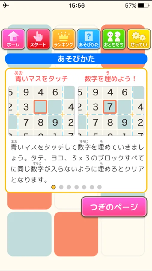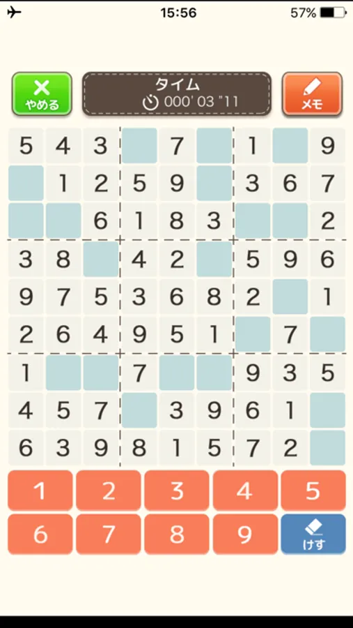 縦と横、3x3のブロック内に同じ数字が入ることなく全てのマスが埋まるとクリアとなります。