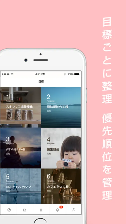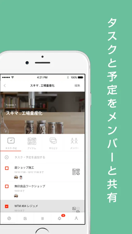 目標ごとにタスク・予定とアイテムをみんなで共有。