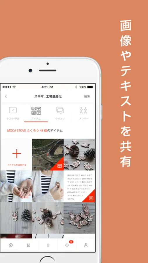 「アイテム」写真、場所、文字、リンクを共有できます。