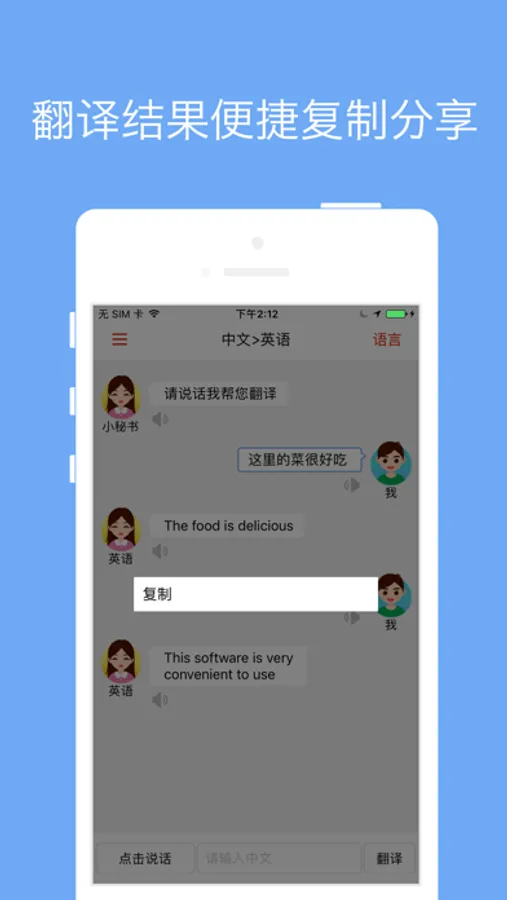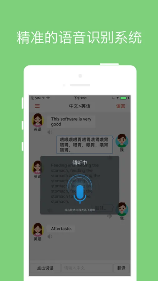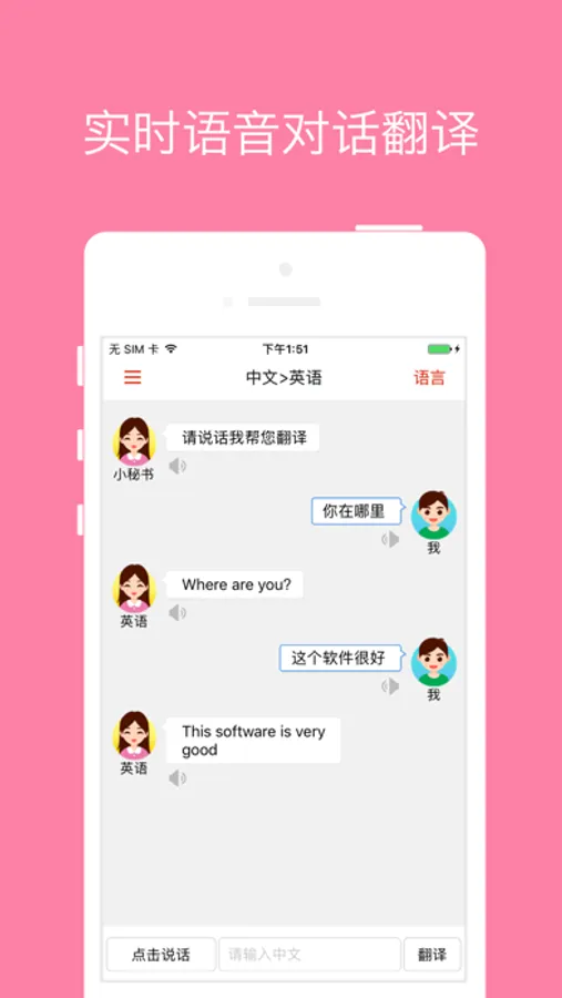 1. 同声翻译:你说中文,她说英文,您输入英文她说中文,是你学习英语,和老外交流OR做生意OR出国旅行,查询单词句子的强大工具。