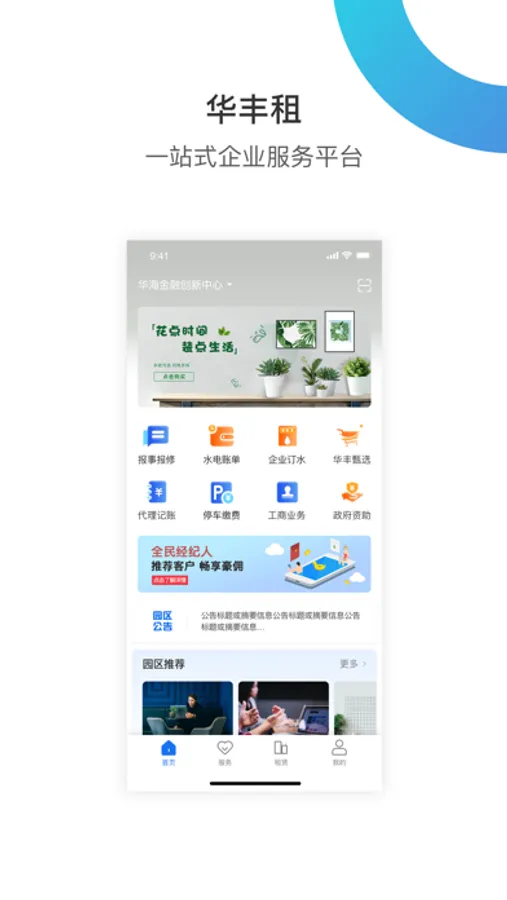 华丰租,一款为华丰旗下园区提供专属服务的APP,隶属于深圳市道网科技有限公司。产品助力企业快速对接园区基础物业服务与增值服务,并搭建企业之间的合作交流与资源对接平台,以促进园区企业快速发展。华丰租APP包含三大服务板块,分别是孵化宝、华丰租、华丰会。