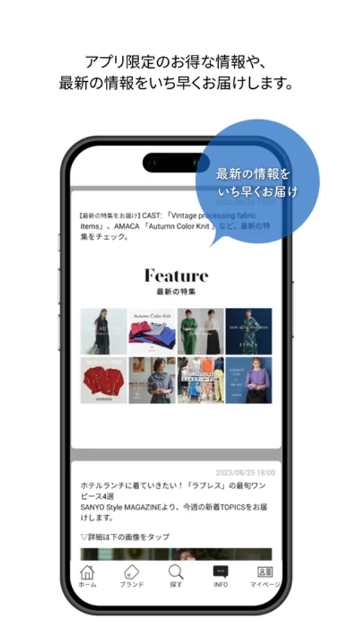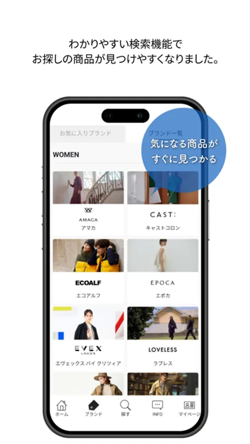 お気に入りブランドを登録すると、登録したブランドの商品やスタッフコーディネート、お近くの店舗を手軽にチェックできます。