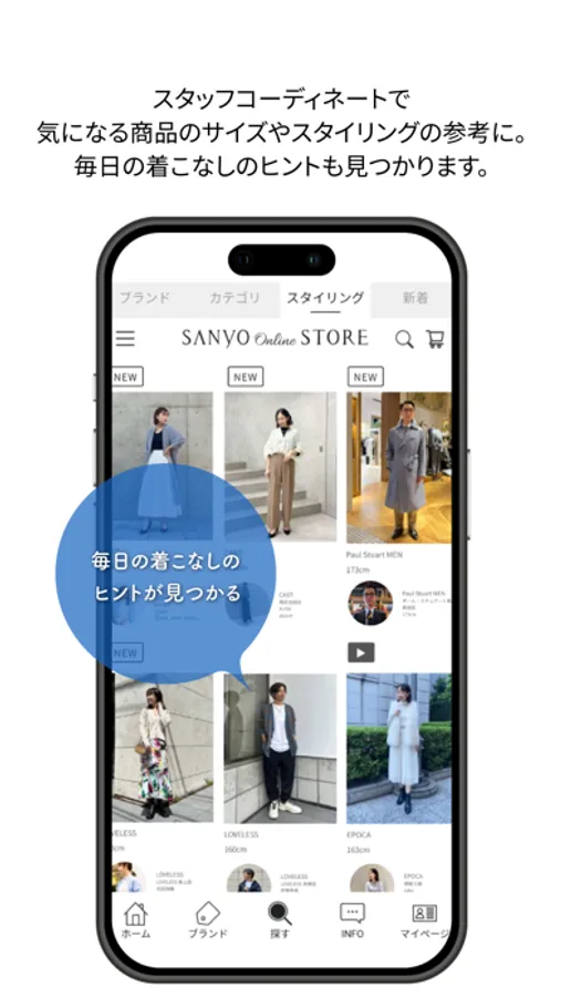 スタッフコーディネートで気になる商品のサイズやスタイリングの参考に。
