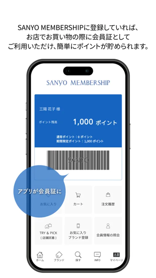 SANYO MEMBERSHIPに登録していれば、お店でお買い物の際に会員証としてご利用いただけ、簡単にポイントが貯められます。