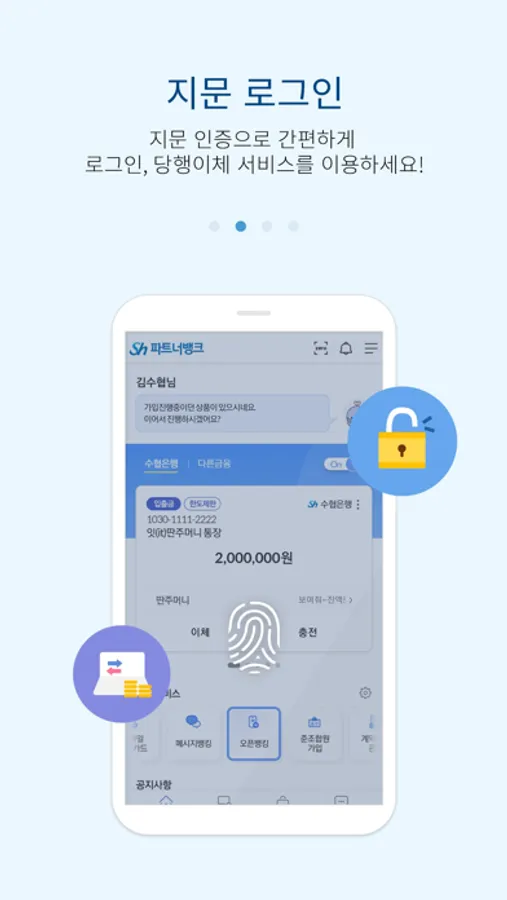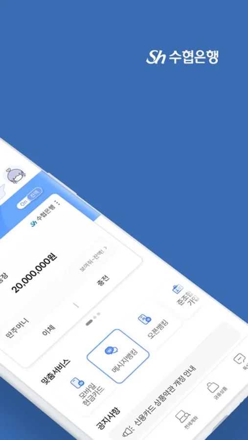 수협은행은 보안강화, 앱 업데이트 등의 이유로 보안카드, OTP, 스마트보안카드 등 금융정보를 요구하지 않습니다. (피싱방지, 보안설정 등의 기능을 활용하여 수협 파트너뱅크를 사칭한 악성 앱에 주의하시기 바랍니다.