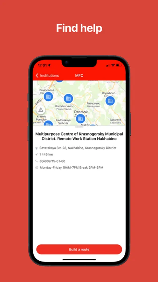 Use the interactive map in our app to find medical institutions, fire stations, police stations, MFCs and other administrative institutions. The map will also help you to quickly build a route.
