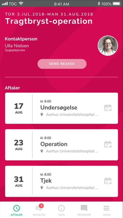 Message function: In the message function you can always contact the healthcare professionals at the department which you are connected to and may have questions for along the way.