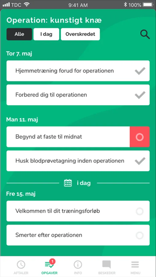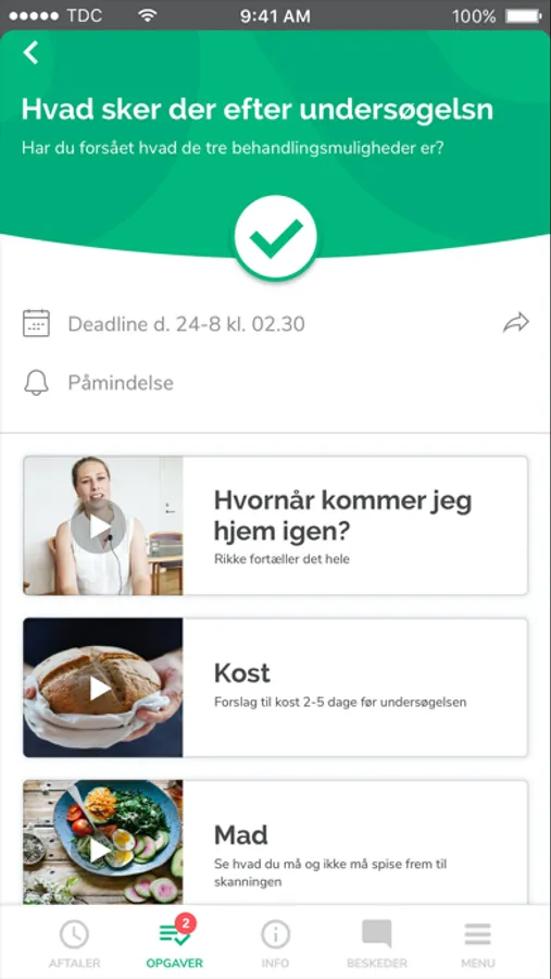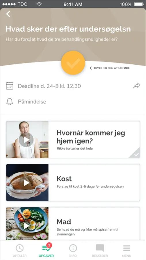 List of activities: There is a number of activities spread out on a timeline which you can mark as done. The timeline symbolizes your treatment process. You will receive notifications on an ongoing basis that remind you to do the activities e.g. start fasting.