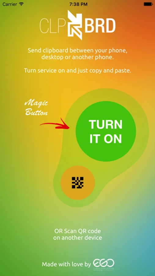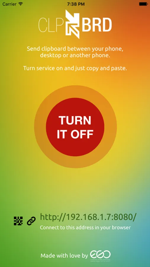 Push “Magic button” launching the service. Enter IP address the app shows into browser URL bar. Ready! You see CLPBRD service desktop interface with text input field for sending data to phone clipboard. As long as you input and send text from this page, your phone clipboard receives it. The text copied on your phone will be immediately sent to input field of CLPBRD browser page.