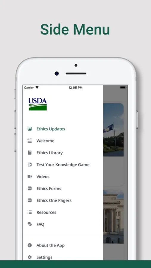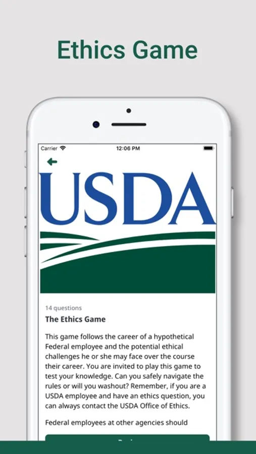 This interactive mobile app provides USDA employees – and other Federal government employees – with short easy-to-read summaries of the Federal ethics rules and the Hatch Act's limitations on political activity. This information is available, at your fingertips, in a well-organized Ethics Library.