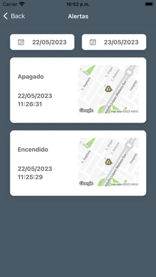 Localización: Obtén la ubicación cada 10 segundos en desde Indacar, conoce los viajes realizados, cada alerta te dirá donde sucedió el evento y crea geocercas para administrar de manera sencilla cuando entra o sale de ubicaciones especificas.