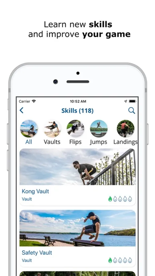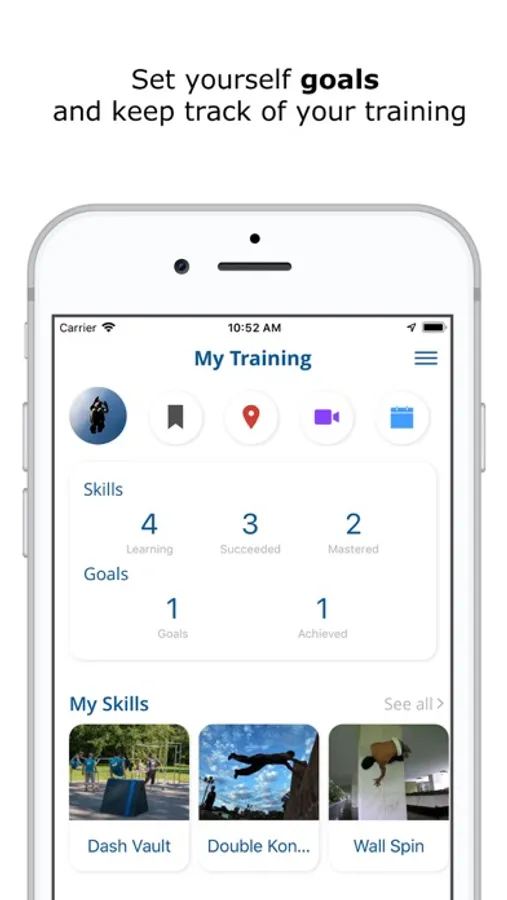 Have access to over 100 indexed skills. Each skill contains videos of how to perform it, prerequisites, a difficulty scale and a list of related skills. You can also see clips of other traceurs who achieved it. Keep track of your training by marking a skill as “learning”, “achieved” and “mastered”. You can also set yourself goals including skills plus a specific height and distance.