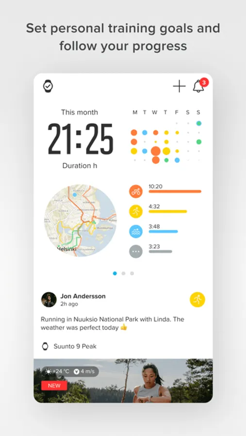 The Suunto community is a vibrant and diverse group, sharing inspiring stories and experiences every day. Social sharing on Suunto app is personalizable - select whether you want to share distance, calories, speed, pace, duration, heart rate, ascent, even max speed! It’s up to you!