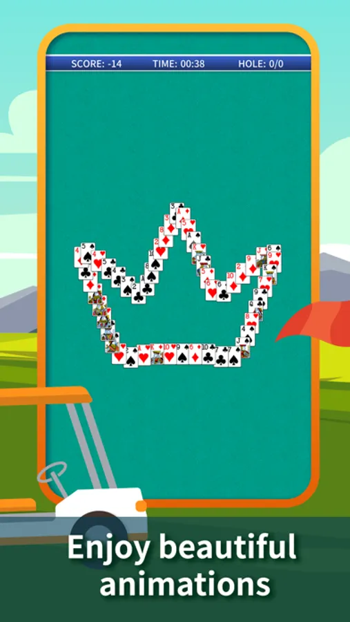 If you like the classic Klondike Solitaire, FreeCell Solitaire, Spider Solitaire, Pyramid Solitaire, will also love the unique and addictive Golf Solitaire card game. Golf is one of the most played patience games in the world, it is a variant of TriPeaks and BlackHole Solitaire. The objective of the game is to complete Golf course consisting of one, nine or eighteen "holes". Each "hole" is a tableau of 7 columns of 5 cards each are dealt, all face up. One additional card is dealt as the base of the foundation. The remaining 16 cards are turned face down to form the stock and are your "strokes". To win a hole you need to clear all the cards form the table to foundation using as few strokes as possible just like in real life golf game. Cards are played in sequence from least to greatest or greatest to least, regardless the suit and color, no dragging and moving card stacks required. Play as long as you like, no locks, no restrictions. Prove your skills, score best, be on top of leaderboards and get achievements and share your results with friends. Golf Solitaire is simple to learn, but hard to master.