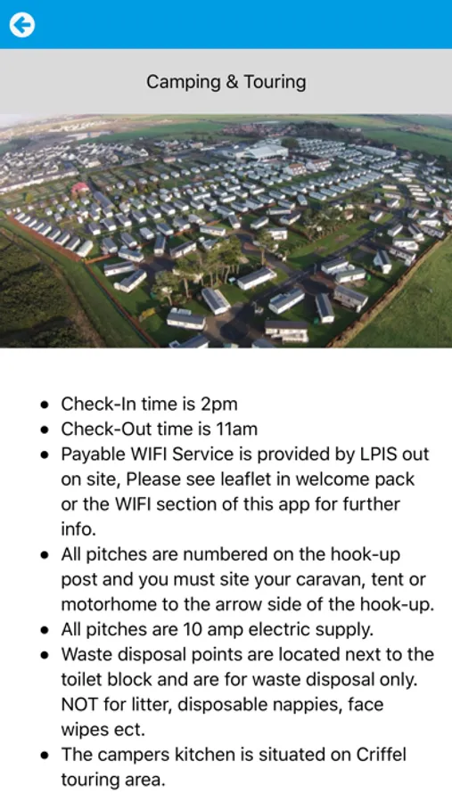 All pitches have Electric (240 volt, 10 amp), water, sewage, hook-ups and chemical disposal points.