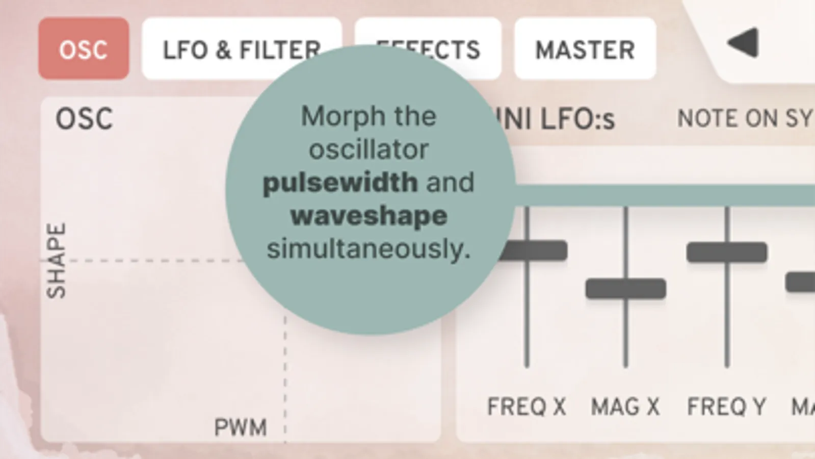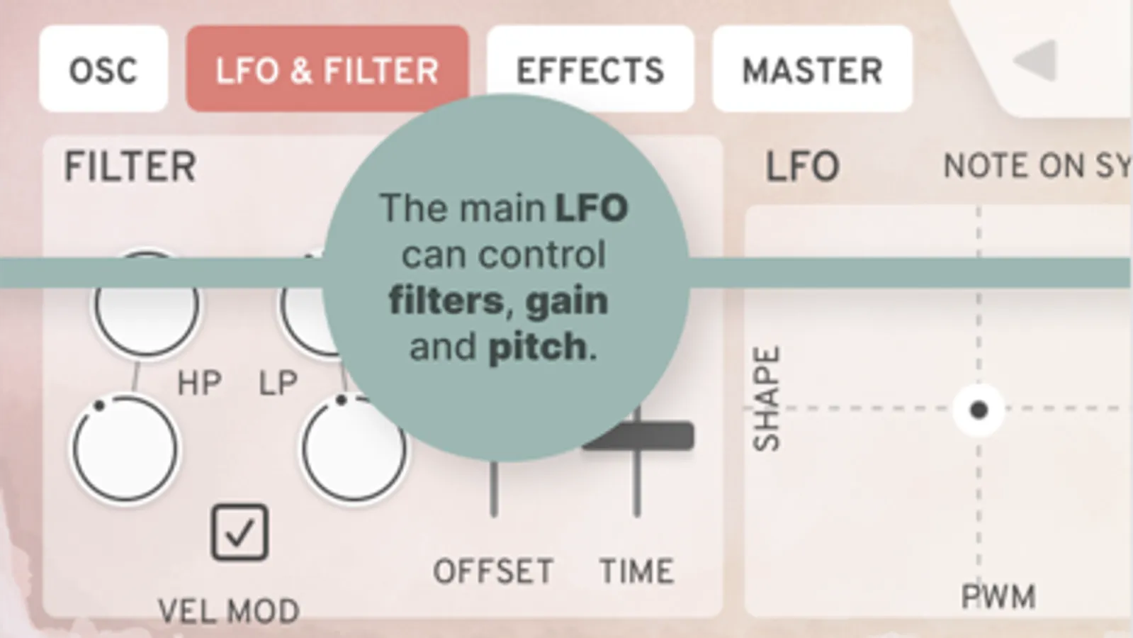 The additional LFO can be shaped exactly as the oscillator, and optionally controls filters, gain and pitch (using a modulation wheel or just automatcally). This LFO can be synchronized to a AUv3 host.