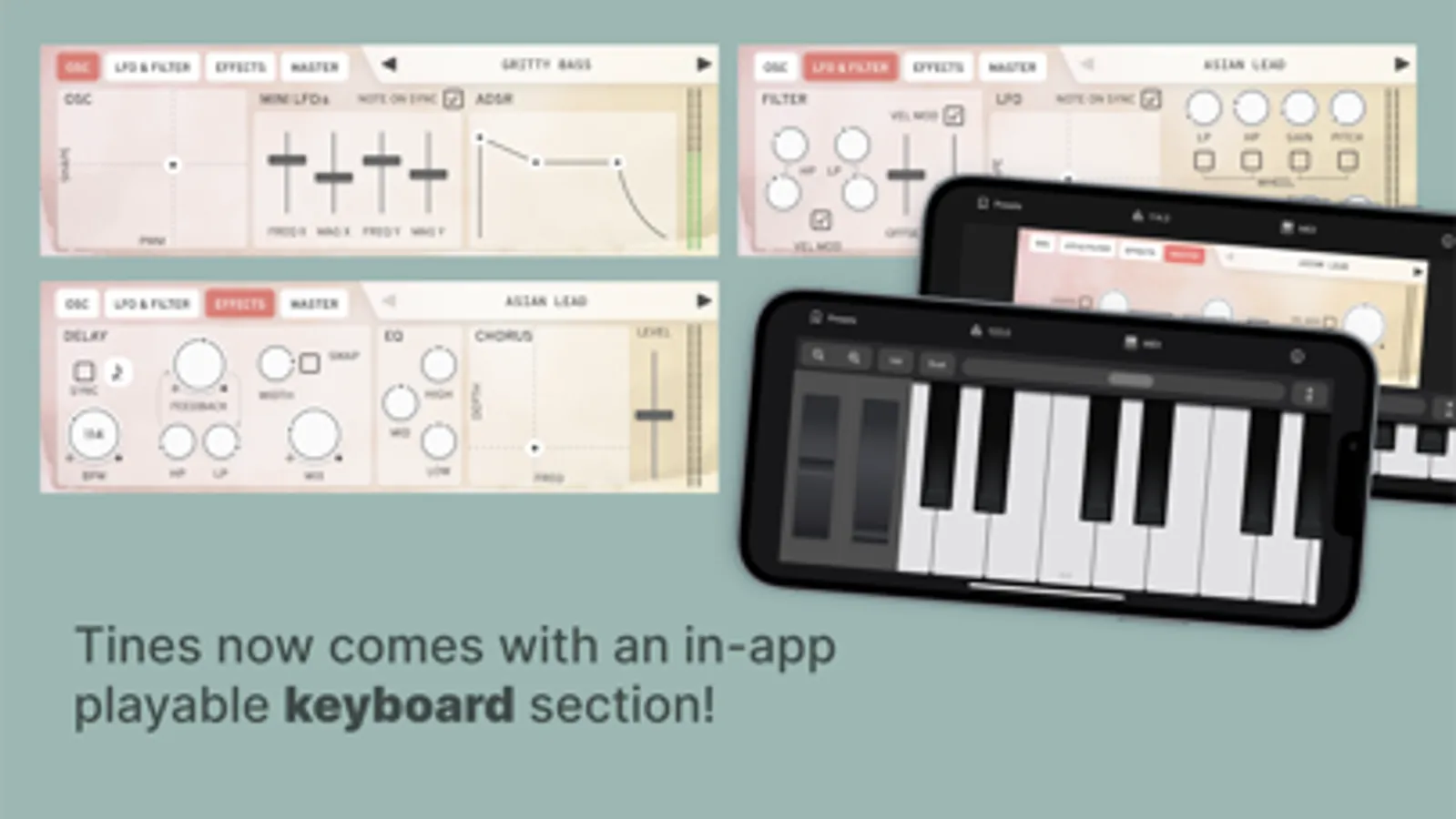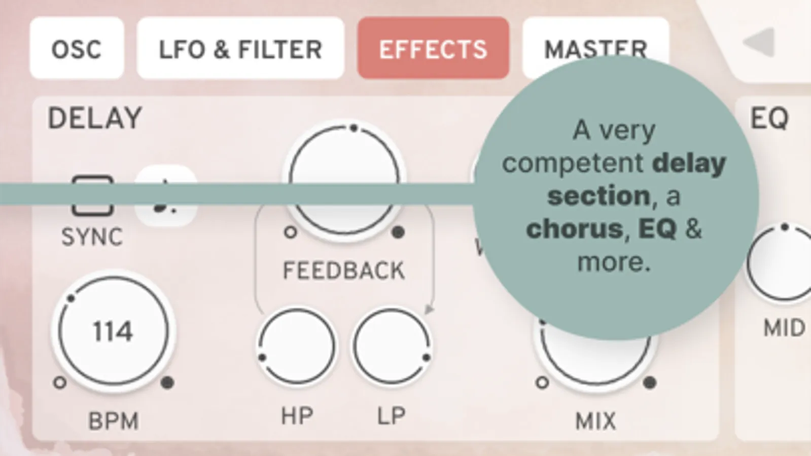 Globally there’s a nice stereo chorus, ping pong stereo delay (that also can sync to a AUv3 hosts bpm) and EQ.