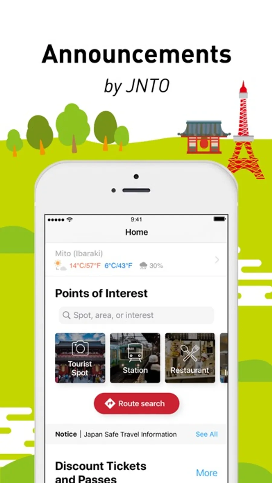“Japan Official Travel App” is the official smartphone app provided by Japan National Tourism Organization (JNTO), delivering up-to-date information about traveling in Japan for a safe and comfortable journey.