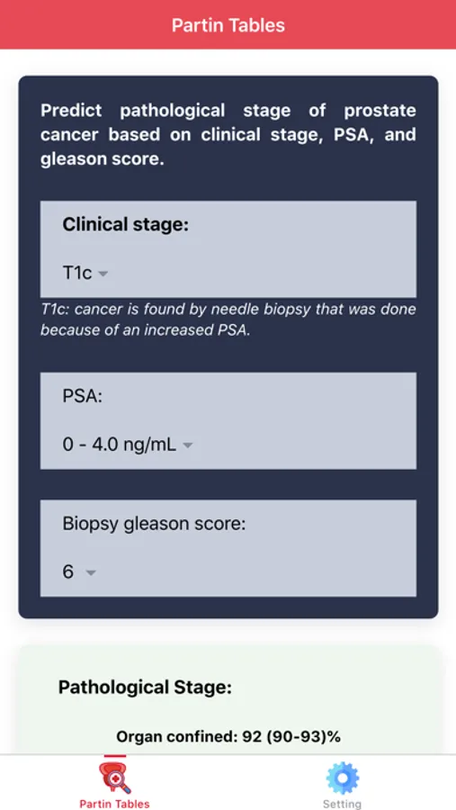 Around 93% of newly diagnosed prostate cancer patients present with localized or regional disease. The use of "Urology Partin Tables: Prostate Cancer Evaluation" app may shift toward identifying men with intermediate-risk to high-risk disease for whom the ratio of treatment benefit to harm may be greatest, or to identify men with low-risk to intermediate-risk disease who may benefit from active surveillance. The results were from an analysis of 5629 men treated with prostatectomy (without additional therapy) between 2006 and 2011 at the Johns Hopkins Hospital. In this app, you should input patient's information regarding clinical stage, serum PSA, and gleason score. "Urology Partin Tables: Prostate Cancer Evaluation" app will then calculate the probability of pathological stage (organ confined, extraprotastic extension, seminal vesicle involvement, and lymph node involvement).