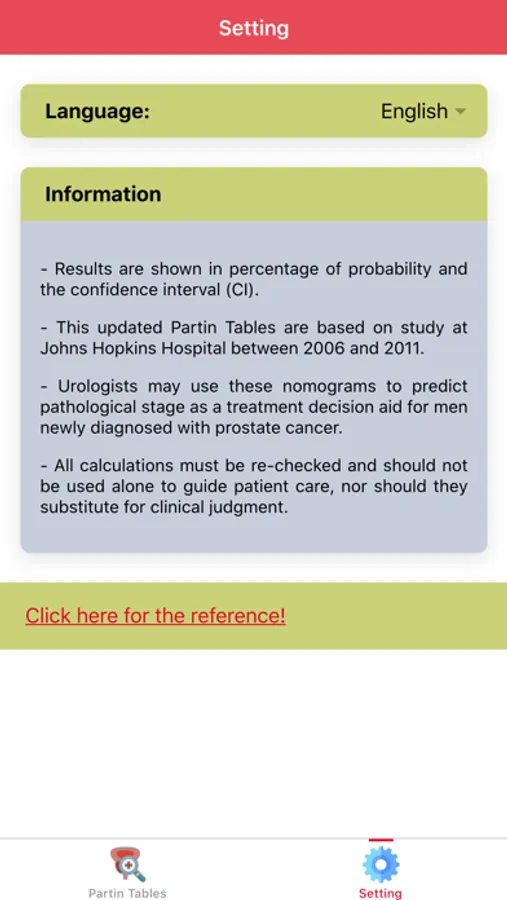 Disclaimer: all calculations must be re-checked and should not be used alone to guide patient care, nor should they substitute for clinical judgment. Calculations in this "Urology Partin Tables: Prostate Cancer Evaluation" app might be different with your local practice. Consult to expert doctor whenever necessary.