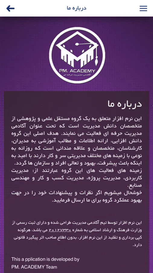 This is a practical & professional application which is developed for managers, experts, professionals and students of management. The aim of developing of this application is to train, improve & increase the knowledge and performances of managers & experts and also making an opportunity for organizations excellence. The contexts are classified into: Management, Project Management, Business Management & Industrial Engineering. Specifications: - Professional and applicable management contexts - Videos - Bookstore - Direct links to Instagram page & Telegram channel - Job opportunities - Consulting Tip: This Version is offered only in Persian.