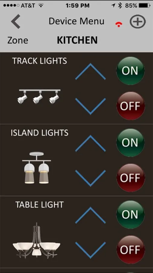 • Dim or Brighten lamps and lighting fixtures selected by name and icon images on the iOS touchscreen.