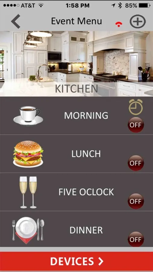 Areas of the home are organized by Zones and Rooms. Each Zone is assigned a list of devices user can control. Event activities are user created for scenes combining lighting and other devices with one touch. The GUI uses photo icons to identify zones, rooms, events and devices. Advanced scheduling of Events can be done through few clicks on your iPhone or iOS device.