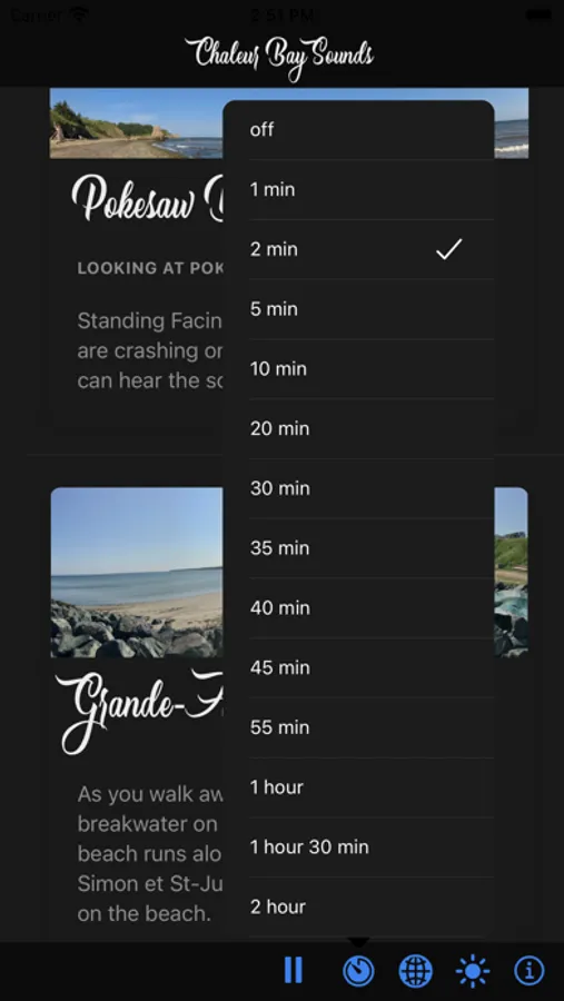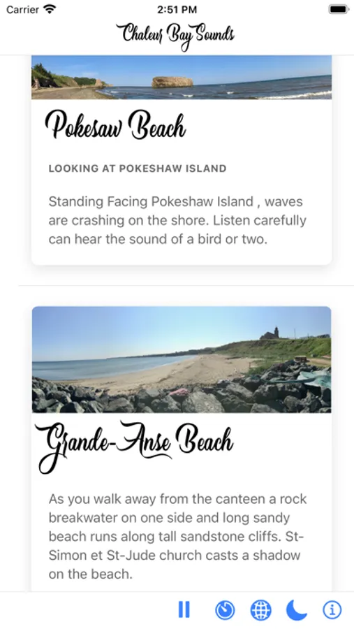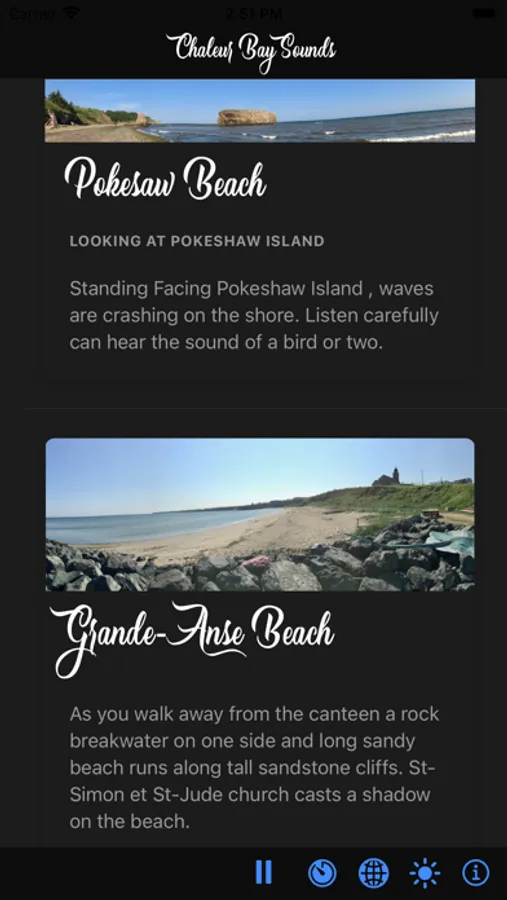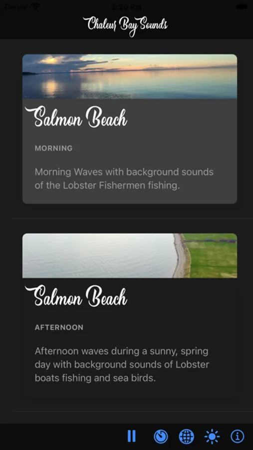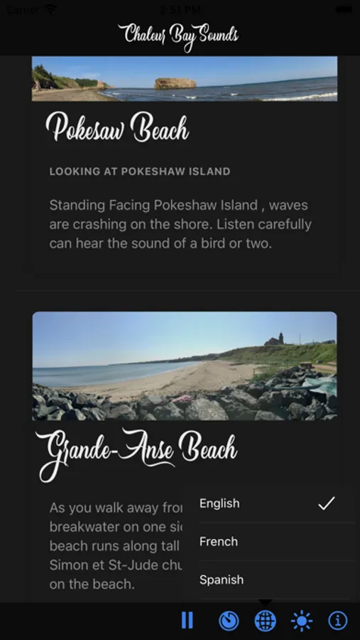 Sit back and relax to the sounds of the Bay of Chaleur. Listen to various waves and sounds from one of the most beautiful bays of the world. Fall asleep using a sleep timer . Localization setting allow you to switch between French, Spanish and English .