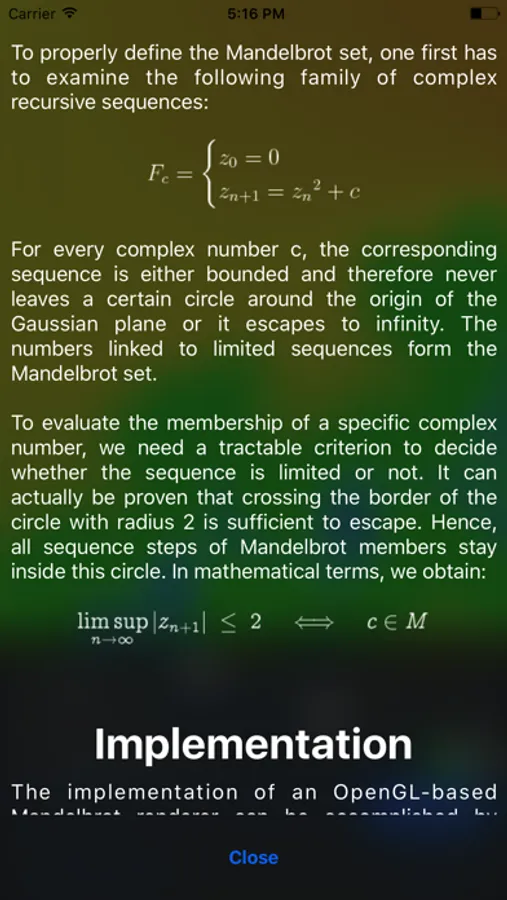 Render beautiful snapshots of the well-known Mandelbrot set on your iOS device!