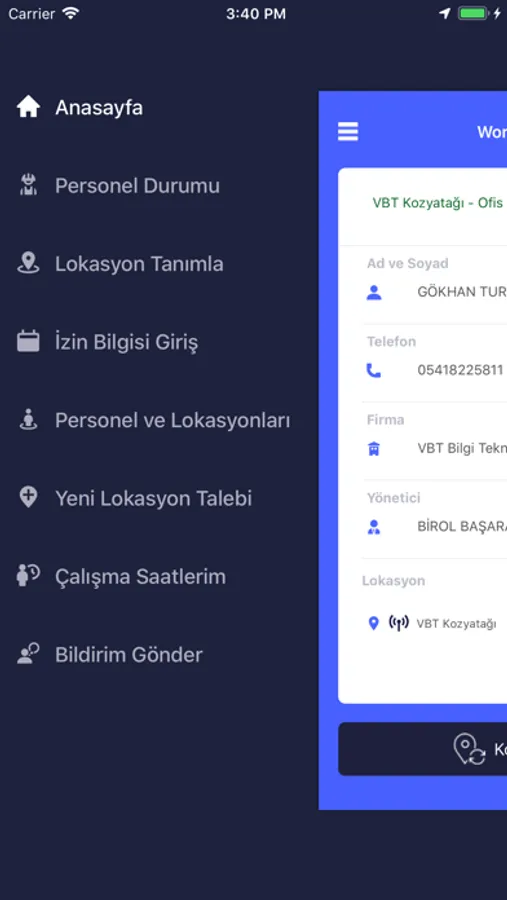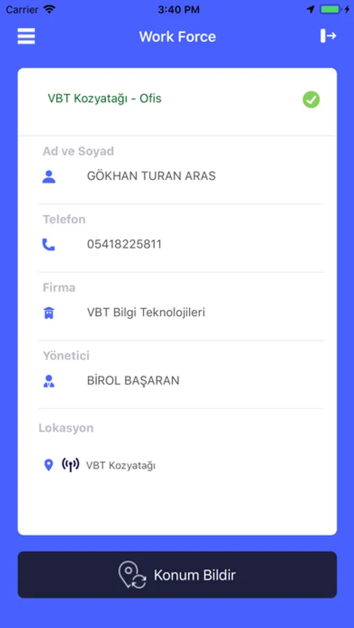 VBT Work Force bir şirket içi eleman takip uygulamasıdır. Şirket çalışanlarının belirlenen geofence alanlarına giriş çıkışları takip edilmektedir. Geofence alanlarına göre çalışmala saatleri takip edilmektedir.