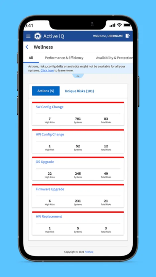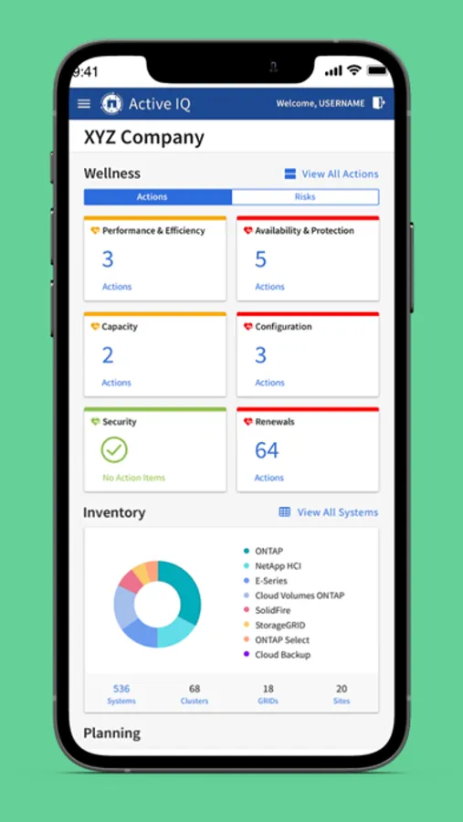 NetApp Active IQ is a digital advisor that simplifies the proactive care and optimization of NetApp storage. Fuelled by telemetry data from our highly diverse installed base, it uses advanced AI and ML techniques to uncover opportunities to reduce risk and improve the performance and efficiency of your storage environment. It then provides the prescriptive guidance and actions to make it happen. This “actionable intelligence” simplifies storage administration and leads to higher availability, improved security, and higher-performing storage.