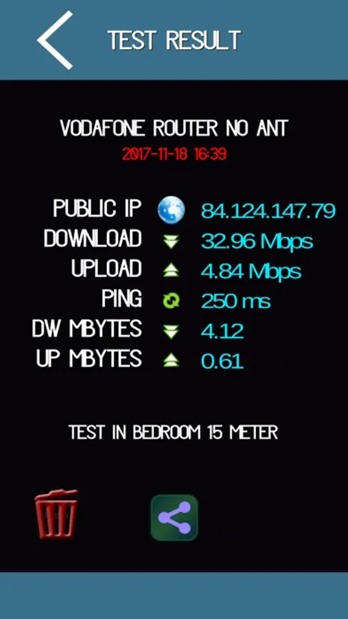 With this simple and free application you can measure the quality of your Wi-Fi connection or mobile data, simply touch a button. Measures download speed, upload speed and ping. It also shows your public IP and the data obtained in mega bits per second and in megabytes per second.