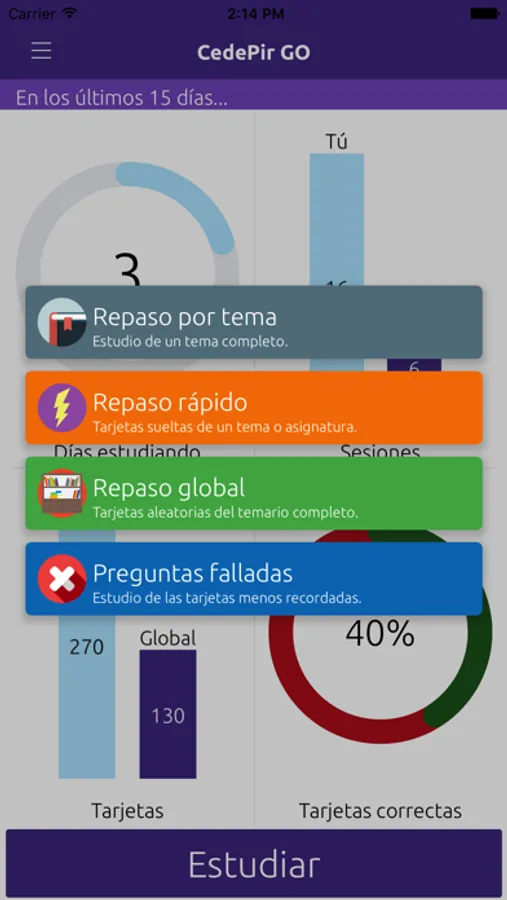 CedePir GO genera una serie de estadísticas que te permitirán conocer tu progreso, tales como el número de sesiones de estudio por día o el número de tarjetas recordadas correctamente.
