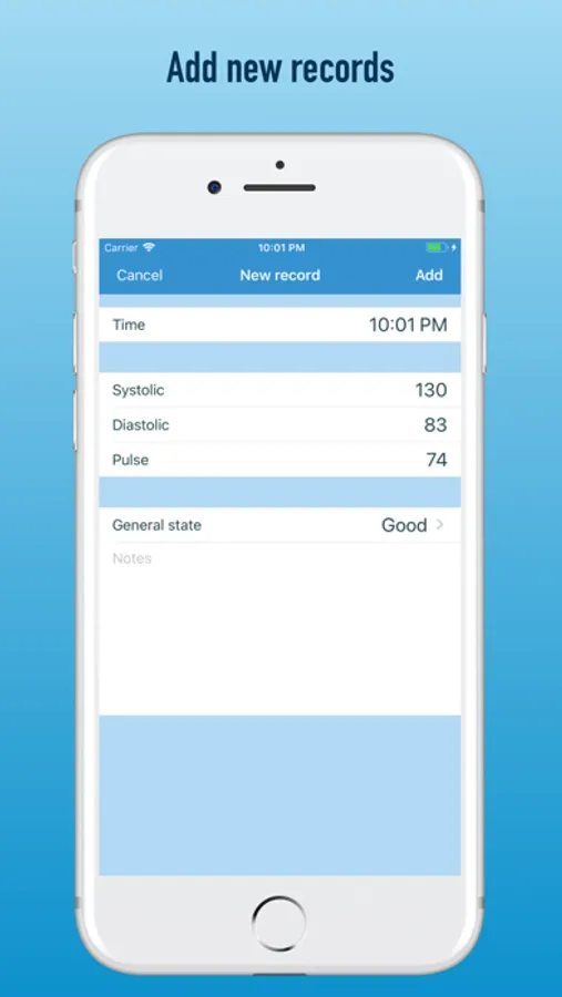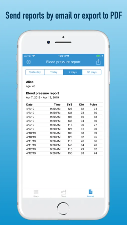 You can make records of blood pressure measurements and see the history in different forms: blood pressure log, chart or report. Also, you can send a report via email or save it as a PDF-file.