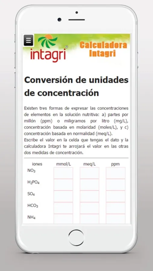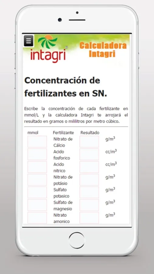 Los resultados de la solución nutritiva (SN) se expresan en unidades de concentración. Esta herramienta permite realizar el cálculo para convertir la concentración en cantidades necesarias de fertilizante expresada en kilogramos o litros por metro cúbico de agua que se deben añadir.