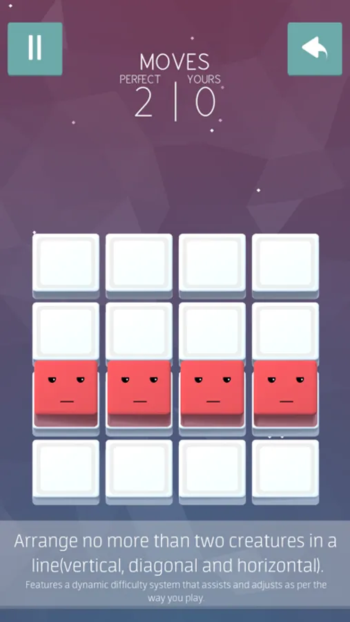 Phase Spur is a casual brain puzzle game with cute little creatures. Phase Spur features an unique reverse match 3 gameplay. When the creatures are happy, their spirit and cuteness endear everyone, so much so, it’s easy to get carried away by their cuteness. However, when they are disturbed, they can be quite annoying. So, here's a thing, MAKE THEM HAPPY! The task is, arrange no more than two creatures in a line. As they are adamant in nature, no three creatures (not more than two) can exist along a line (vertical, diagonal and horizontal) from their point of view.