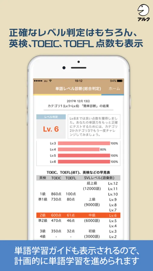 単語レベル診断機能をダウンロードします。SVLのレベルはもちろん、英検、TOEIC、TOEFLの目安点数まで正確に判定します。