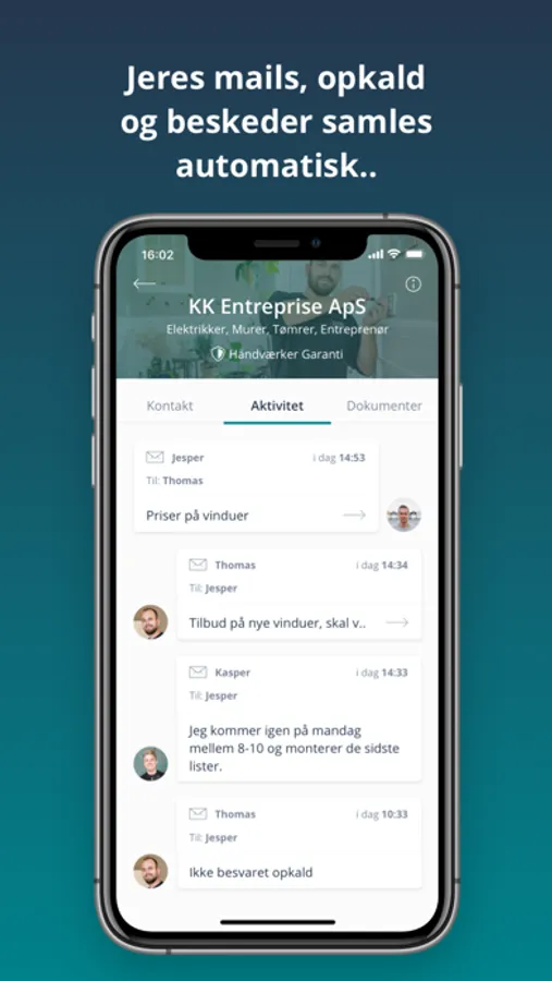 Alle mails, opkald og beskeder mellem dig og håndværkervirksomhedens forskellige medarbejdere samles automatisk på en tidslinje, så begge parter altid har overblik over, hvad der er aftalt og hvornår.