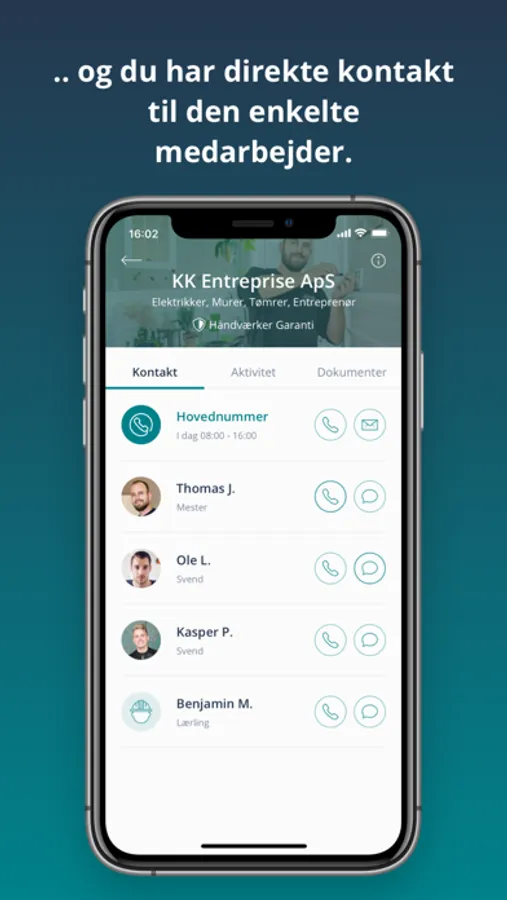 App'en viser håndværkerens hovednummer men også kontaktinfo på deres medarbejderne, så du nemt kan få kontakt til netop din håndværker.