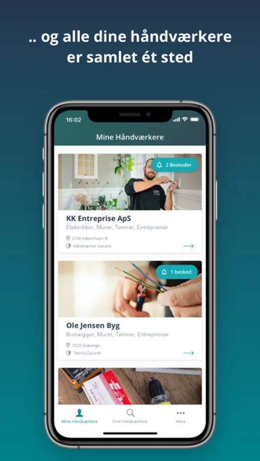 Du kan samle alle dine håndværkere i appen, hvilket gør det nemt at kontakte dem næste gang, du skal bruge hjælp. Og nemt at dele kontaktinfo hvis en ven eller kollega står og efterspørger en dygtig håndværker.