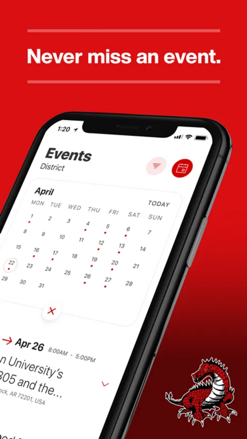 The event section shows a list of events throughout the district. Users can add an event to your calendar to share the event with friends and family with one tap.
