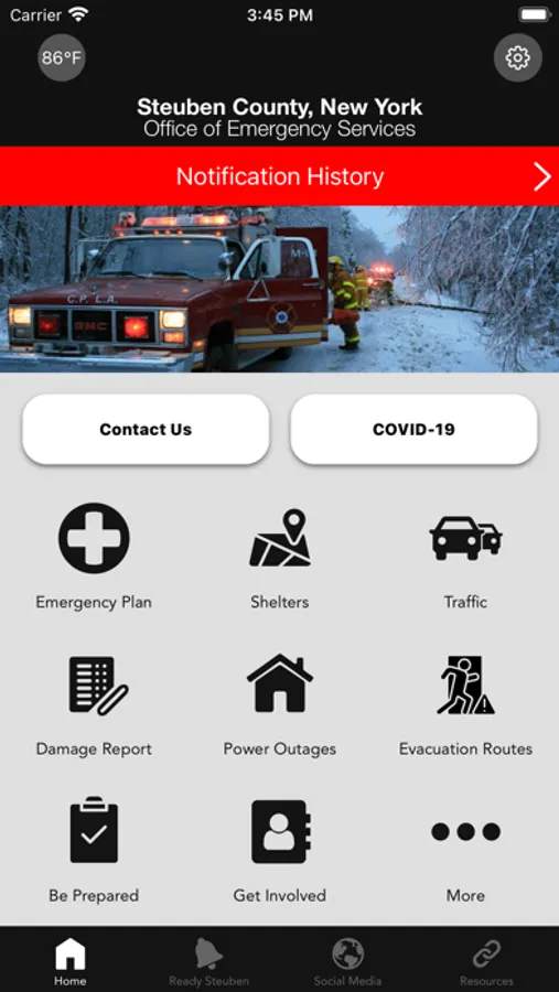 Steuben County Emergency Services has created a mobile application for use by residents and others interested in gaining knowledge about disasters and emergencies in Steuben County NY. Ready Steuben is a mobile application for SMART Phones available to individuals interested in gaining emergency information for Steuben County, NY. With this application, you can gain access to important information about emergency situations, submit damage reports, get up to date weather information, manage emergency contacts, and keep track of your emergency kit. The application provides links to updated power outage information, traffic information, shelter locations, evacuation routes and functional needs registry. To assist residents and those who work or travel in Steuben County, NY through technology, the app can aid citizens in preparedness by sharing tips and preparedness/preventions measures. When you use this app it will better prepare you and help the County gain better situational awareness of what is going on in the County during a disaster or emergency. This application is not meant to be used to report emergency situations. If you experience a true emergency please dial or text 911.