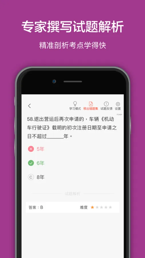全新全国公共科目考试题库+莆田市区域考试题库,模拟真实考试环境体验,特邀资深专家严格按照《莆田市网络预约出租汽车经营服务管理实施细则》撰写试题分析,让你快速理解记忆,吃透考点,考试轻松过关。严格遵循《莆田市网络预约出租汽车驾驶员从业资格考试大纲》出题规则,提供顺序、模拟、随机、章节多角度科学练题模式,帮助司机短时间内提升考试通过率。