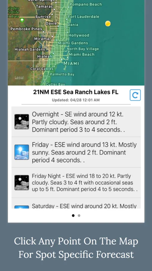 Simply tap anywhere on the map and view NOAA's spot specific point & zone marine and tide forecast.