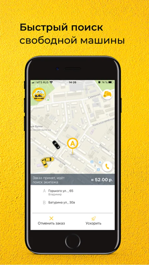 В приложении Би Би Такси Владимир отображается движение машины к вам и вся информация по заказу: марка и номер автомобиля, данные о водителе, а также примерное время прибытия.