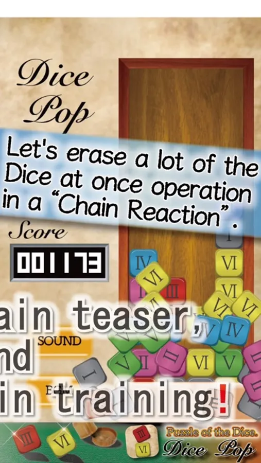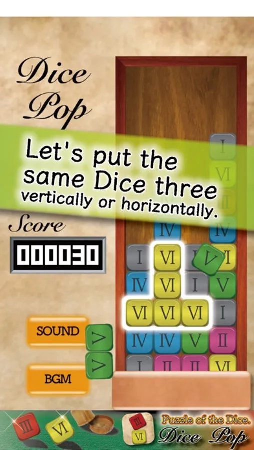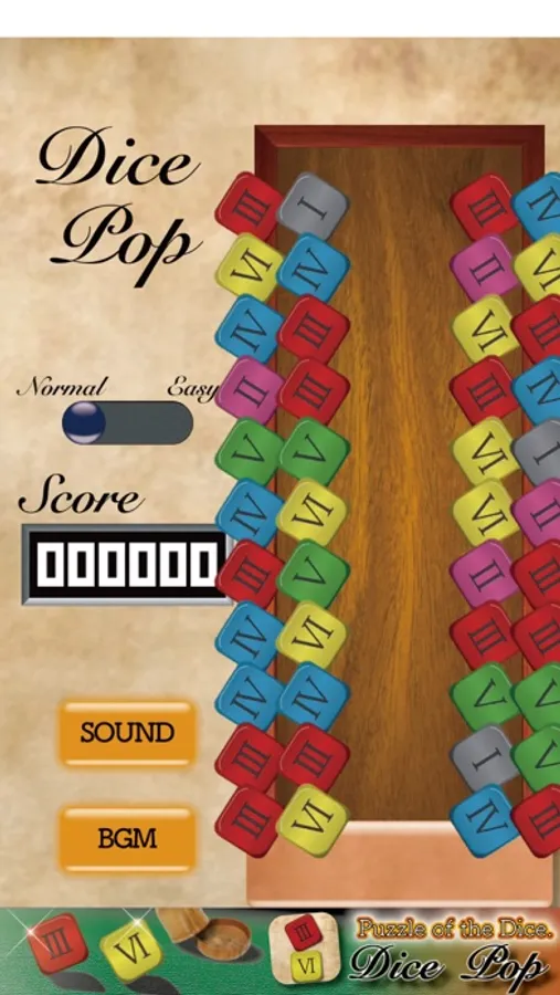 When three or more dice of the same color line up in the vertical direction or the horizontal direction, its dice are also poping from the field and disappears.