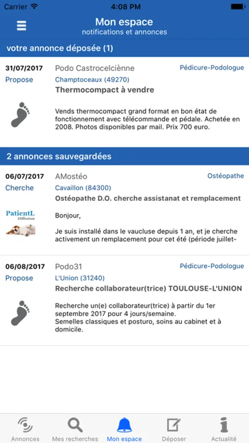 Vos annonces seront diffusées sur le site de PatientL-Diffusion et dans les logiciels, PodoEvolution et PatientL.