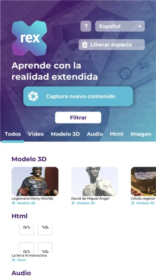 Todos los objetos CAPTURADOS se almacenan localmente en el dispositivo para facilitar el acceso a los contenidos. El usuario en la BIBLIOTECA puede eliminar los objetos que considere que no va a utilizar y utilizar los filtros de la propia aplicación para organizar los objetos descargados.